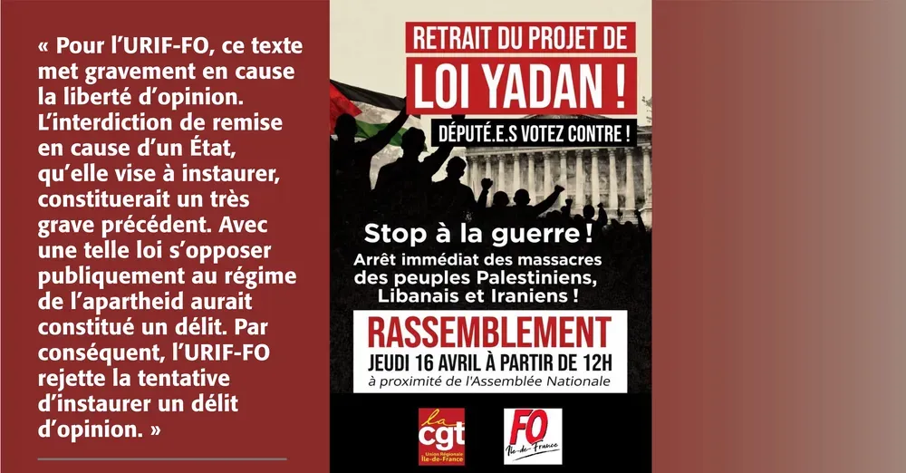 « Députés, votez contre ! »Les unions régionales d’Île-de-France (URIF) FO et CGT appellent conjointement à se rassembler à proximité de l’Assemblée nationale, le jeudi 16 avril, pour exiger des députés qu’ils ne votent pas la loi Yadan (affiche ci-contre). On lira ci-dessous, le communiqué FO. « Depuis plus de deux ans notre union régionale Île-de-France Force ouvrière (URIF-FO) dénonce avec constance les massacres, le génocide dans la bande de Gaza, exige un cessez-le-feu immédiat, la levée du blocus organisé par le gouvernement israélien de Netanyahou. Pour chercher à empêcher la solidarité avec le peuple palestinien, le gouvernement Macron-Lecornu à travers une députée de la “majorité présidentielle”, Caroline Yadan, députée des Français de l’étranger, notamment d’Israël, va présenter ces jeudi et vendredi 16 & 17 avril un projet de loi “visant à lutter contre les formes renouvelées de l’antisémitisme”. Pour notre URIF FO, nous restons sur nos principes et valeurs en rejetant et condamnant toutes formes de racismes et rejet de l’autre, rien n’est à “renouveler”. Ce projet de loi ne fera qu’amplifier les interprétations pour punir les opinions qui ne seraient pas dans le cadre de la bien-pensance. (…) Pour l’URIF-FO, ce texte met gravement en cause la liberté d’opinion. L’interdiction de remise en cause d’un État, qu’elle vise à instaurer, constituerait un très grave précédent. Avec une telle loi s’opposer publiquement au régime de l’apartheid aurait constitué un délit. Par conséquent, l’URIF-FO rejette la tentative d’instaurer un délit d’opinion. Il forcerait à l’acceptation du génocide en cours. La partialité est confirmée par la rédaction de ce projet de loi qui ne condamne qu’à “lutter contre les formes renouvelées de l’antisémitisme”. Ce projet de loi vise clairement à réprimer davantage le mouvement de solidarité avec le peuple palestinien, à interdire toutes les recherches et expressions académiques sur Israël ou les Palestiniens et à faire taire toute voix exigeant l’arrêt du génocide en cours, donc le cessez-le-feu immédiat et permanent à Gaza, la levée du blocus, l’acheminement de l’aide humanitaire, la fin des relations diplomatiques avec le gouvernement de Netanyahou, comme l’a fait notre confédération à plusieurs reprises. Notre URIF-FO appelle les députés à voter contre ce projet de loi et invite toutes ces structures à se rassembler le premier jour de l’examen du texte le : jeudi 16 avril à partir de 12 heures à proximité de l’Assemble nationale. Par ailleurs, les camarades sont invités à signer la pétition contre le projet de loi Yadan qui a recueilli d’ores et déjà plus de 500 000 signatures. » |